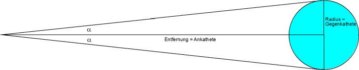 Wir bestimmen die scheinbare "Größe", d.h. den Sehwinkel, abhängig von der tatsächlichen Größe der Erde bzw. des Mondes und der Entfernung des Beobachters: Der Radius der Erde bzw. des Mondes und die Entfernung des Beobachters bilden einen rechten Winkel. Die Entfernung ist die Ankathete, der Radius die Gegenkathete des rechtwinkligen Dreiecks. Je größer die Entfernung (Ankathete), desto kleiner wird der Winkel alpha.. Das Verhältnis Gegenkathete (Radius, feste Größe) zu Ankathete (variabel) ist der TANGENS des Winkels alpha. Den Winkel selbst finden wir mit dem Taschenrechner, in dem wir diesen Wert (Quotient G/K) stehen lassen, auf 2nd (gelbe Taste) und dann auf TAN (TAN-1) drücken. Das Ergebnis (Winkel alpha) ist dann nur noch zu verdoppeln.