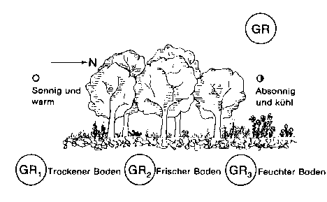 Jeweils mit trockenem Boden (GR1), frischem Boden (GR2), oder feuchtem Boden (GR3). Ähnliche Bedingungen, meist ohne Wurzeleinwirkungen