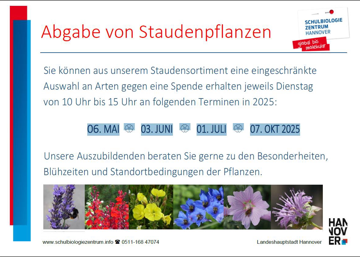 Insektenbündnis Hannover mit dem Schulbiologiezentrum als Kooperationspartner www.hannover.de/insektenbündnis-hannover Broschüren; Flyer und die Blühmischung (Blühende Gärten) sind im Schulbiologiezentrum erhältlich
