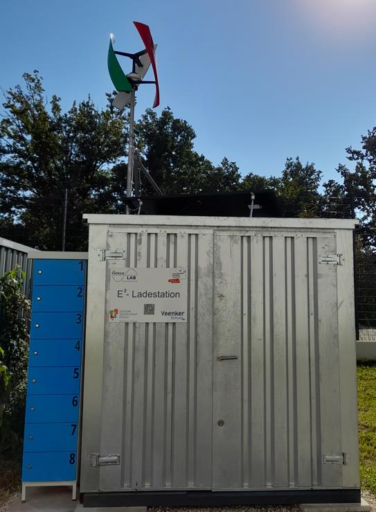 gespeicherten Strom wird ein Ladeschrank für E-Bike-Akkus versorgt.  Foto links: E2-Ladestation  Foto rechts: mobile Ladesäule